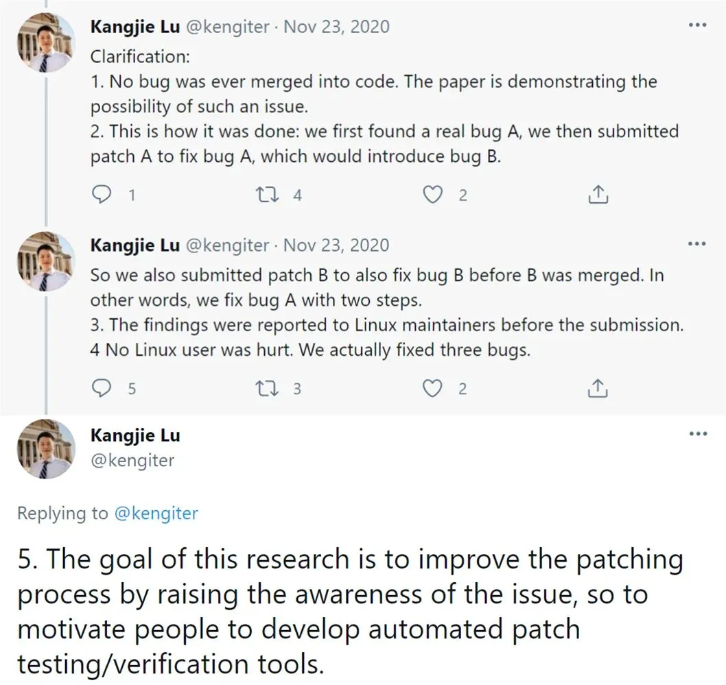 这些研究者是不是故意为之呢?又会不会对 Linux 造成损害呢?Kangjie Lu 教授之前已经对自己的研究做出了以下声明: