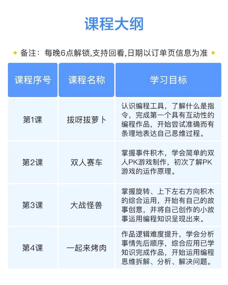 每堂课程巧妙设计,明确学习目标,课程一次购买,可反复回看,帮助孩子系统了解编程工具,快速入门。