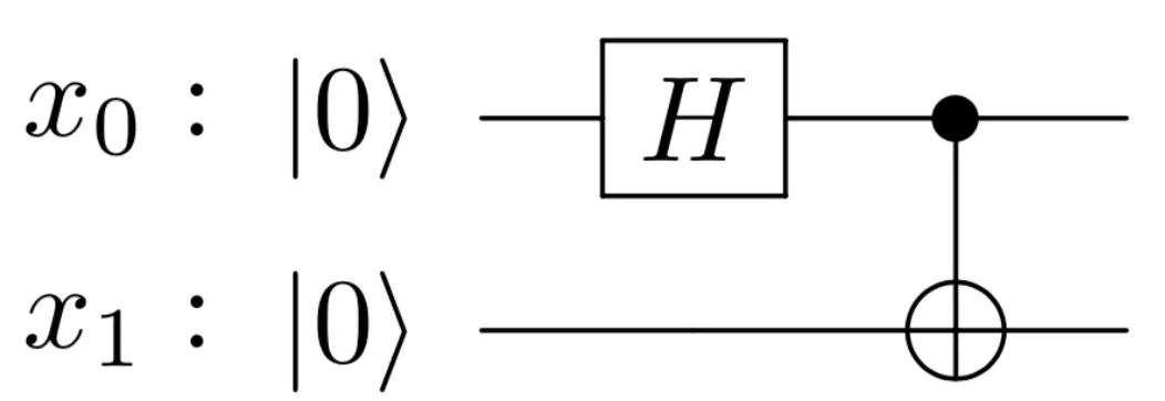 H是Hadamard门,应用于量子比特x0。●-⊕是CNOT门,●是控制量子比特,⊕是目标量子比特。“-”是为了帮助我们表示受影响的两个量子比特。换句话说,我们正在应用CNOT量子门,其中控制态为量子比特x0,目标态为x1。注意,我们这些门的应用顺序很重要。在此图中,我们首先应用H,然后应用CNOT。