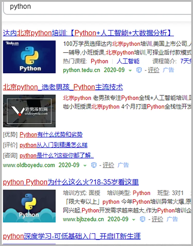 如果你在百度搜索python,前几页搜索结果都被培训班的“推广”霸占,恍惚中给人一种莆田系终于把触手伸到编程教育领域了的错觉。