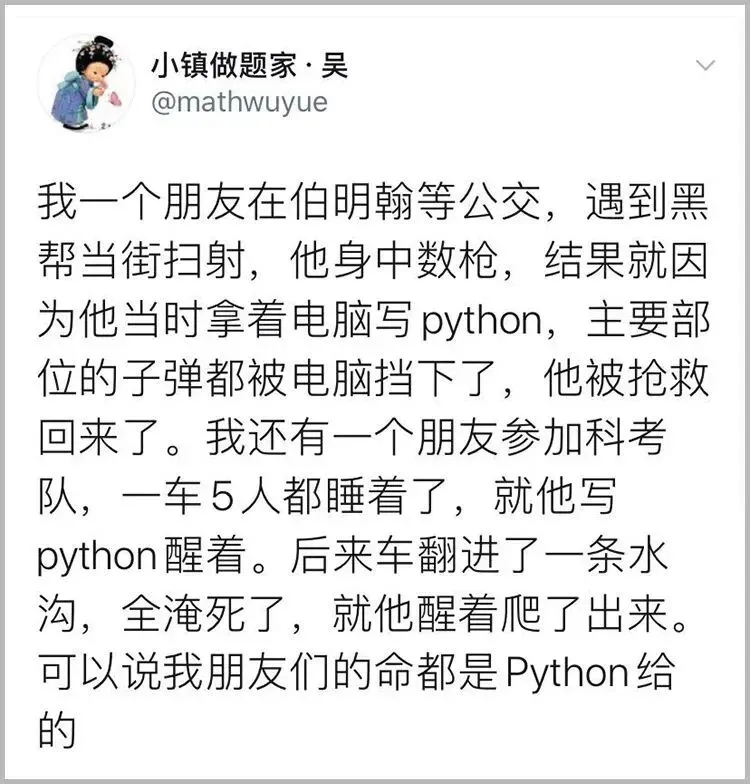 python已经成了一种生活方式,当你跟一个文学少女讨论《边城》的时候,她脑子里可能浮现的是python而不是沈从文。