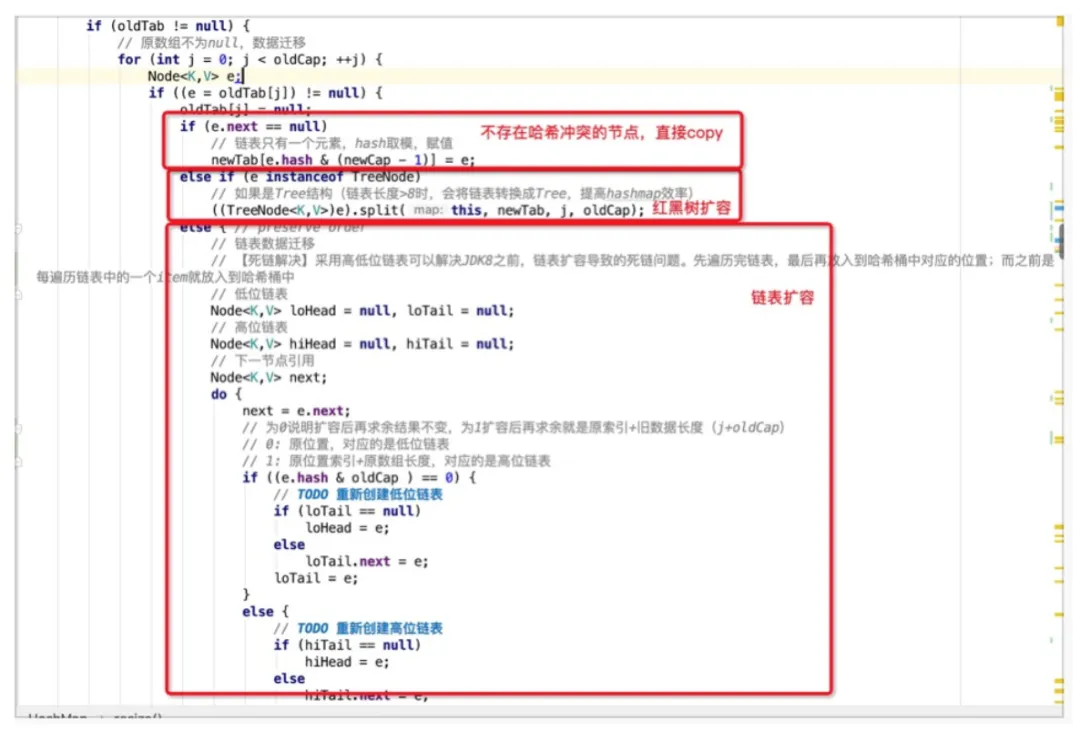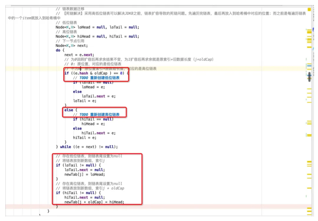 在JDK1.8之前,HashMap在并发场景下扩容时存在一个bug,形成死链,导致get该位置元素的时候,会死循环,使CPU利用率高居不下。这也说明了HashMap不适于用在高并发的场景,高并发应该优先考虑JUC中的ConcurrentHashMap。然而,精益求精的JDK开发者们并没有选择绕过问题,而是选择直面问题并解决它。在JDK1.8之中,引入了高低位链表(双端链表)。什么是高低位链表呢?在扩容时,哈希桶数组buckets会扩容一倍,以容量为8的HashMap为例,原有容量8扩容至16,将[0, 7]称为低位,[8, 15]称为高位,低位对应loHead、loTail,高位对应hiHead、hiTail。扩容时会依次遍历旧buckets数组的每一个位置上面的元素:若存在冲突元素,则采用高低位链表进行处理。通过e.hash & oldCap来判断取模后是落在高位还是低位。举个例子:假设当前元素hashCode为0001(忽略高位),其运算结果等于0,说明扩容后结果不变,取模后还是落在低位[0, 7],即0001 & 1000 = 0000,还是原位置,再用低位链表将这类的元素链接起来。假设当前元素的hashCode为1001, 其运算结果不为0,即1001 & 1000 = 1000 ,扩容后会落在高位,新的位置刚好是旧数组索引(1) + 旧数据长度(8) = 9,再用高位链表将这些元素链接起来。最后,将高低位链表的头节点分别放在扩容后数组newTab的指定位置上,即完成了扩容操作。这种实现降低了对共享资源newTab的访问频次,先组织冲突节点,最后再放入newTab的指定位置。避免了JDK1.8之前每遍历一个元素就放入newTab中,从而导致并发扩容下的死链问题。
