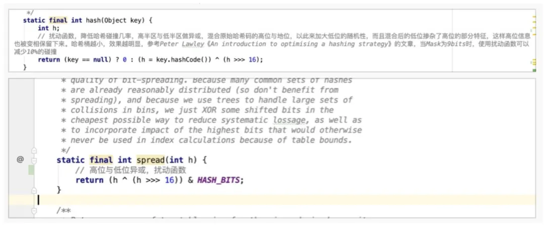 哈希表以哈希命名,足以说明哈希计算在该数据结构中的重要程度。而在实现中,JDK并没有直接使用Object的native方法返回的hashCode作为最终的哈希值,而是进行了二次加工。以下分别为HashMap与ConcurrentHashMap计算hash值的方法,核心的计算逻辑相同,都是使用key对应的hashCode与其hashCode右移16位的结果进行异或操作。此处,将高16位与低16位进行异或的操作称之为扰动函数,目的是将高位的特征融入到低位之中,降低哈希冲突的概率。