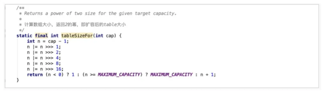 因此,计算的意义在于找到大于等于cap的最小2的整数次幂。整个过程是找到cap对应二进制中最高位的1,然后每次以2倍的步长(依次移位1、2、4、8、16)复制最高位1到后面的所有低位,把最高位1后面的所有位全部置为1,最后进行+1,即完成了进位。0100 10100111 11111000 0000