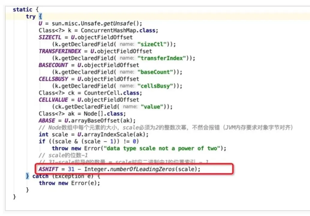 ConcurrentHashMap中的ABASE+ASHIFT是用来计算哈希数组中某个元素在实际内存中的初始位置,ASHIFT采取的计算方式是31与scale前导0的数量做差,也就是scale的实际位数-1。scale就是哈希桶数组Node[]中每个元素的大小,通过((long)i << ASHIFT) + ABASE)进行计算,便可得到数组中第i个元素的起始内存地址。