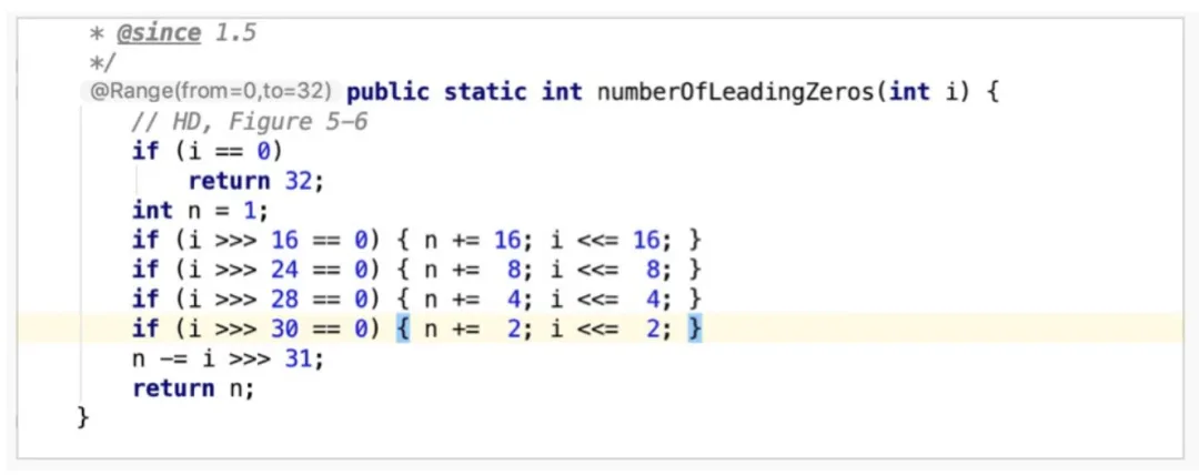 我们继续看下前导0的数量是怎么计算出来的,numberOfLeadingZeros是Integer的静态方法,还是沿用找规律的方式一探究竟。
