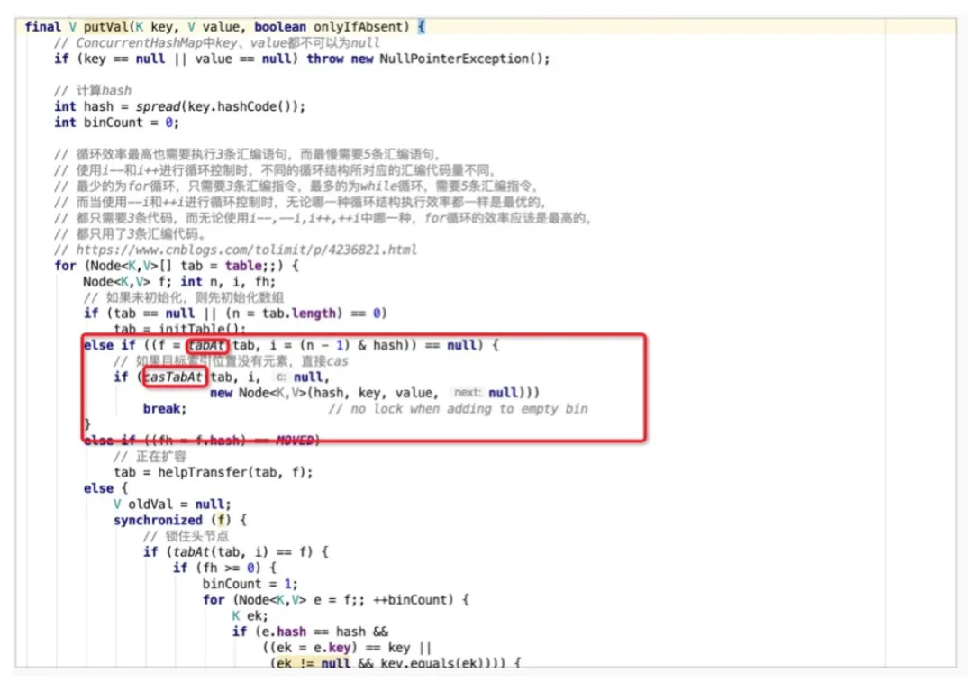 ConcurrentHashMap中的乐观锁是采用synchronized+CAS进行实现的。这里主要看下put的相关代码。当put的元素在哈希桶数组中不存在时,则直接CAS进行写操作。