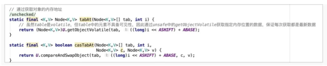 这里涉及到了两个重要的操作,tabAt与casTabAt。可以看出,这里面都使用了Unsafe类的方法。Unsafe这个类在日常的开发过程中比较罕见。我们通常对Java语言的认知是:Java语言是安全的,所有操作都基于JVM,在安全可控的范围内进行。然而,Unsafe这个类会打破这个边界,使Java拥有C的能力,可以操作任意内存地址,是一把双刃剑。这里使用到了前文中所提到的ASHIFT,来计算出指定元素的起始内存地址,再通过getObjectVolatile与compareAndSwapObject分别进行取值与CAS操作。在获取哈希桶数组中指定位置的元素时为什么不能直接get而是要使用getObjectVolatile呢?因为在JVM的内存模型中,每个线程有自己的工作内存,也就是栈中的局部变量表,它是主存的一份copy。因此,线程1对某个共享资源进行了更新操作,并写入到主存,而线程2的工作内存之中可能还是旧值,脏数据便产生了。Java中的volatile是用来解决上述问题,保证可见性,任意线程对volatile关键字修饰的变量进行更新时,会使其它线程中该变量的副本失效,需要从主存中获取最新值。虽然ConcurrentHashMap中的Node数组是由volatile修饰的,可以保证可见性,但是Node数组中元素是不具备可见性的。因此,在获取数据时通过Unsafe的方法直接到主存中拿,保证获取的数据是最新的。