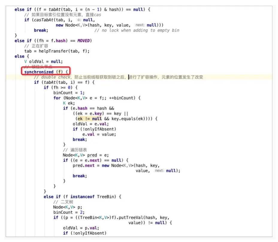 继续往下看put方法的逻辑,当put的元素在哈希桶数组中存在,并且不处于扩容状态时,则使用synchronized锁定哈希桶数组中第i个位置中的第一个元素f(头节点2),接着进行double check,类似于DCL单例模式的思想。校验通过后,会遍历当前冲突链上的元素,并选择合适的位置进行put操作。此外,ConcurrentHashMap也沿用了HashMap中解决哈希冲突的方案,链表+红黑树。这里只有在发生哈希冲突的情况下才使用synchronized锁定头节点,其实是比分段锁更细粒度的锁实现,只在特定场景下锁定其中一个哈希桶,降低锁的影响范围。
