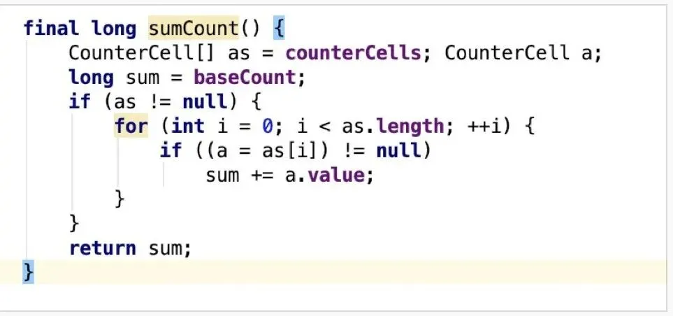 Java Map针对并发场景解决方案的演进方向可以归结为,从悲观锁到乐观锁,从粗粒度锁到细粒度锁,这也可以作为我们在日常并发编程中的指导方针。CounterCell是JDK1.8中引入用来并发求和的利器,而在这之前采用的是【尝试无锁求和】+【冲突时加锁重试】的策略。看下CounterCell的注释,它是改编自LongAdder和Striped64。我们先看下求和操作,其实就是取baseCount作为初始值,然后遍历CounterCell数组中的每一个cell,将各个cell的值进行累加。这里额外说明下@sun.misc.Contender注解的作用,它是Java8中引入用来解决缓存行伪共享问题的。什么是伪共享呢?简单说下,考虑到CPU与主存之间速度的巨大差异,在CPU中引入了L1、L2、L3多级缓存,缓存中的存储单位是缓存行,缓存行大小为2的整数次幂字节,32-256个字节不等,最常见的是64字节。因此,这将导致不足64字节的变量会共享同一个缓存行,其中一个变量失效会影响到同一个缓存行中的其他变量,致使性能下降,这就是伪共享问题。考虑到不同CPU的缓存行单位的差异性,Java8中便通过该注解将这种差异性屏蔽,根据实际缓存行大小来进行填充,使被修饰的变量能够独占一个缓存行。再来看下CounterCell是如何实现计数的,每当map中的容量有变化时会调用addCount进行计数,核心逻辑如下:接着,我们来看下核心计算逻辑fullAddCount,代码还是比较多的,核心流程是通过一个死循环来实现的,循环体中包含了3个处理分支,为了方便讲解我将它们依次定义A、B、C。冲突检测,当counterCells的引用值不等于当前线程对应的引用值时,说明有其他线程更改了counterCells的引用,出现冲突,则将collide设为false,下次迭代时可进行扩容。