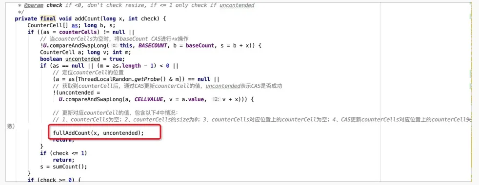 private final void fullAddCount(long x, boolean wasUncontended) { int h; // 初始化probe if ((h = ThreadLocalRandom.getProbe()) == 0) { ThreadLocalRandom.localInit(); // force initialization h = ThreadLocalRandom.getProbe(); wasUncontended = true; } // 用来控制扩容操作 boolean collide = false; // True if last slot nonempty for (;;) { CounterCell[] as; CounterCell a; int n; long v; // 【A】counterCells已经初始化完毕 if ((as = counterCells) != null && (n = as.length) > 0) { // 【a1】对应位置的CounterCell未创建 if ((a = as[(n - 1) & h]) == null) { // cellsBusy其实是一个锁,cellsBusy=0时表示无冲突 if (cellsBusy == 0) { // Try to attach new Cell // 创建新的CounterCell CounterCell r = new CounterCell(x); // Optimistic create // Double Check,加锁(通过CAS将cellsBusy设置1) if (cellsBusy == 0 && U.compareAndSwapInt(this, CELLSBUSY, 0, 1)) { boolean created = false; try { // Recheck under lock CounterCell[] rs; int m, j; // Double Check if ((rs = counterCells) != null && (m = rs.length) > 0 && rs[j = (m - 1) & h] == null) { // 将新创建的CounterCell放入counterCells中 rs[j] = r; created = true; } } finally { // 解锁,这里为什么不用CAS?因为当前流程中需要在获取锁的前提下进行,即串行执行,因此不存在并发更新问题,只需要正常更新即可 cellsBusy = 0; } if (created) break; // 创建失败则重试 continue; // Slot is now non-empty } } // cellsBusy不为0,说明被其他线程争抢到了锁,还不能考虑扩容 collide = false; } //【a2】冲突检测 else if (!wasUncontended) // CAS already known to fail // 调用方addCount中CAS更新cell失败,有冲突,则继续尝试CAS wasUncontended = true; // Continue after rehash //【a3】对应位置的CounterCell不为空,直接CAS进行更新 else if (U.compareAndSwapLong(a, CELLVALUE, v = a.value, v + x)) break; //【a4】容量限制 else if (counterCells != as || n >= NCPU) // 说明counterCells容量的最大值为大于NCPU(实际机器CPU核心的数量)最小2的整数次幂。 // 这里限制的意义在于,并发度是由CPU核心来决定,当counterCells容量与CPU核心数量相等时,理论上讲就算所有CPU核心都在同时运行不同的计数线程时,都不应该出现冲突,每个线程选择各自的cell进行处理即可。如果出现冲突,一定是哈希值的问题,因此采取的措施是重新计算哈希值(h = ThreadLocalRandom.advanceProbe(h)),而不是通过扩容来解决 // 当n大于NCPU时后面的分支就不会走到了 collide = false; // At max size or stale // 【a5】更新扩容标志位 else if (!collide) // 说明映射到cell位置不为空,并且尝试进行CAS更新时失败了,则说明有竞争,将collide设置为true,下次迭代时执行后面的扩容操作,降低竞争度 // 有竞争时,执行rehash+扩容,当容量大于CPU核心时则停止扩容只进行rehash collide = true; // 【a6】加锁扩容 else if (cellsBusy == 0 && U.compareAndSwapInt(this, CELLSBUSY, 0, 1)) { // 加锁扩容 try { if (counterCells == as) {// Expand table unless stale // 扩容1倍 CounterCell[] rs = new CounterCell[n << 1]; for (int i = 0; i < n; ++i) rs[i] = as[i]; counterCells = rs; } } finally { cellsBusy = 0; } collide = false; continue; // Retry with expanded table } //【a7】更换哈希值 h = ThreadLocalRandom.advanceProbe(h); } // 【B】counterCells未初始化完成,且无冲突,则加锁初始化counterCells else if (cellsBusy == 0 && counterCells == as && U.compareAndSwapInt(this, CELLSBUSY, 0, 1)) { boolean init = false; try { // Initialize table if (counterCells == as) { CounterCell[] rs = new CounterCell[2]; rs[h & 1] = new CounterCell(x); counterCells = rs; init = true; } } finally { cellsBusy = 0; } if (init) break; } // 【C】counterCells未初始化完成,且有冲突,则CAS更新baseCount else if (U.compareAndSwapLong(this, BASECOUNT, v = baseCount, v + x)) break; // Fall back on using base }