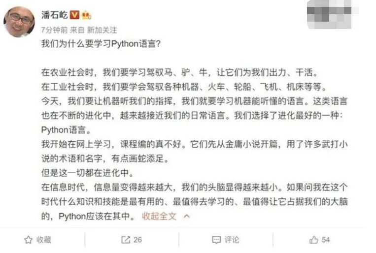 还记得去年11月15日的时候,年过半百的SOHO中国董事长潘石屹突然在微博上宣布,要正式开始学习Python,并表示,“Python是进化最好的一种语言”。