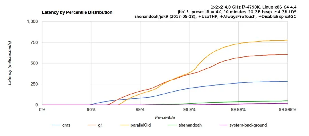 下面是 jbb15 benchmark 中,Shenandoah GC 相对于其他主流 GC 的表现,GC 暂停相比于 CMS 等选择有数量级程度的提高,对于 GC 暂停非常敏感的场景,价值还是很明显的,能够在 SLA 层面有显著提高。当然,这种对于低延迟的保证,也是以消耗 CPU 等计算资源为代价的,实际吞吐量表现也不是非常明朗,需要看企业的实际场景需求,并不是一个一劳永逸的解决方案。