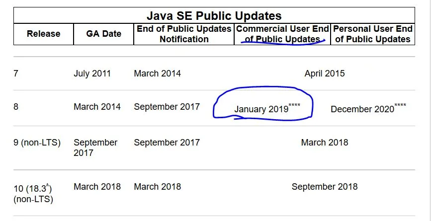 首先,从时间节点来看,JDK 11 的发布正好处在 JDK 8 免费更新到期的前夕,同时 JDK 9、10 也陆续成为“历史版本”,请看下面的 Oracle JDK 支持路线图: