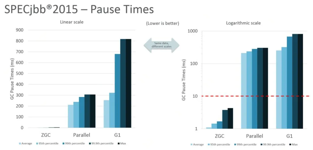 从 JVM GC 的角度,JDK 11 引入了两种新的 GC,其中包括也许是划时代意义的 ZGC,虽然其目前还是实验特性,但是从能力上来看,这是 OpenJDK 的一个巨大突破,为特定生产环境的苛刻需求提供了一个可能的选择。例如,对部分企业核心存储等产品,如果能够保证不超过 10ms 的 GC 暂停,可靠性会上一个大的台阶,这是过去我们进行 GC 调优几乎做不到的,是能与不能的问题。相信你对下面的数据已经不再陌生。