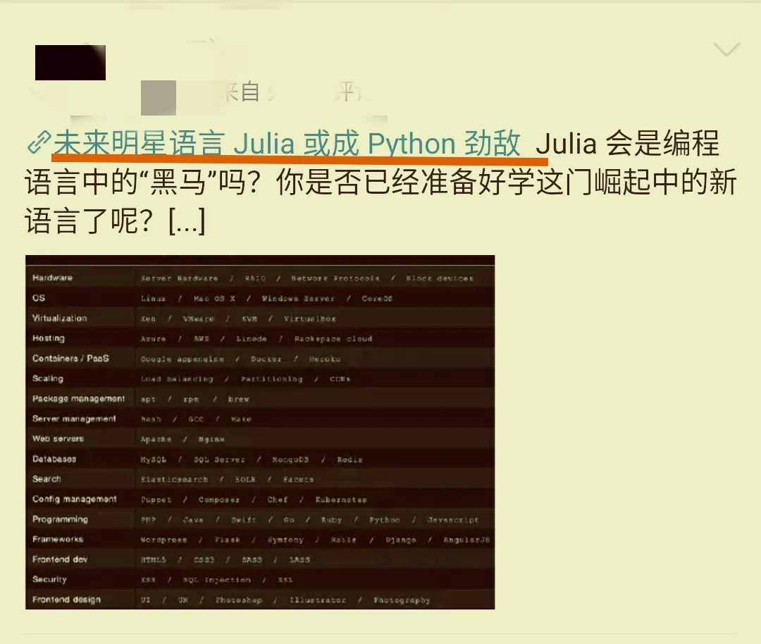 *图片来源:网络如今,Python和R语言通常在机器学习中占主导地位,在开发人员普及方面,Python仍然是增长最快的编程语言,这在很大程度上取决于其机器学习框架和库的优势。相比之下,只有相对较小比例的开发人员使用刚刚起步的Julia。Python在使用范围方面的确占据着绝对优势。