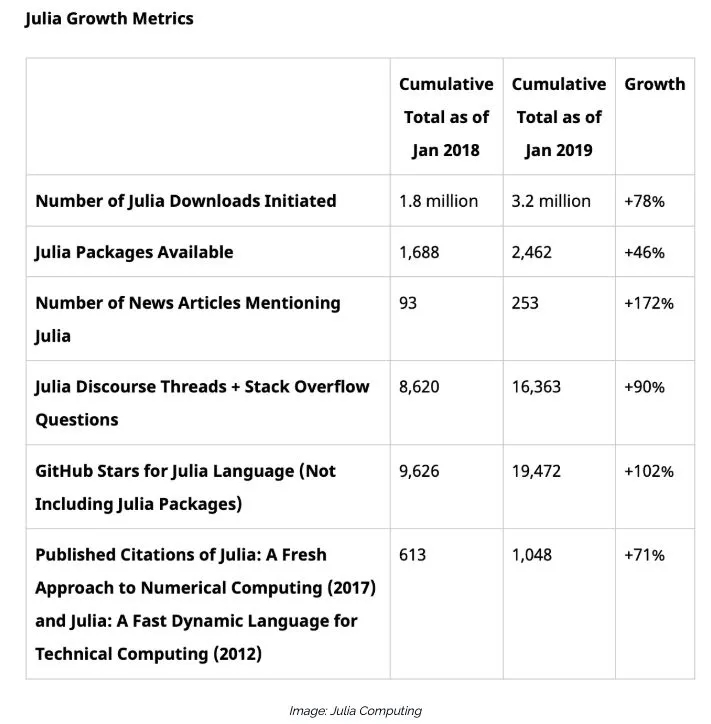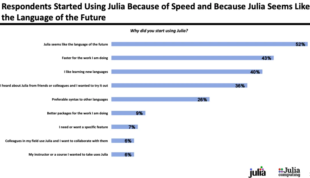 关于”为什么你会使用 Julia“的问题,52% 的受访者表示,Julia 似乎是未来的语言,43% 的人认为,它能使工作速度更快。据外媒 ZDNet 此前发布的数据,Julia 的 GitHub Star 数在过去一年翻了一番,该语言还被 1000 多种学术出版物引用。