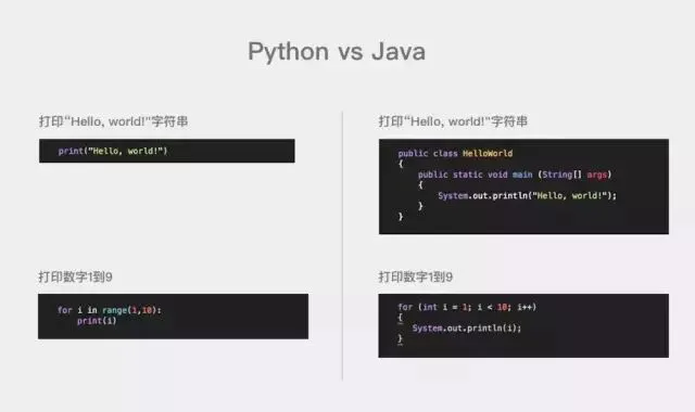 在两会期间,人工智能技术已经成为国家战略,而进入人工智能领域,Python是必经之路,Python工程师炙手可热!当然Python不止可以从事AI相关工作,数据分析、爬虫、Web开发等众多岗位也是大厂必备项!对于初学者来说,简化的人性化语法+快速编写与执行,使得Python非常好入门。在语法上,Python仿佛生来就是为程序员编码效率而考虑的编程语言,很多在其他编程语言编译阶段需要给出的类型限制或约束,在Python中都可以省略。从下面两个简单的Python与Java对比的例子中,就能看出Python简洁的特点:*图片来源:网络