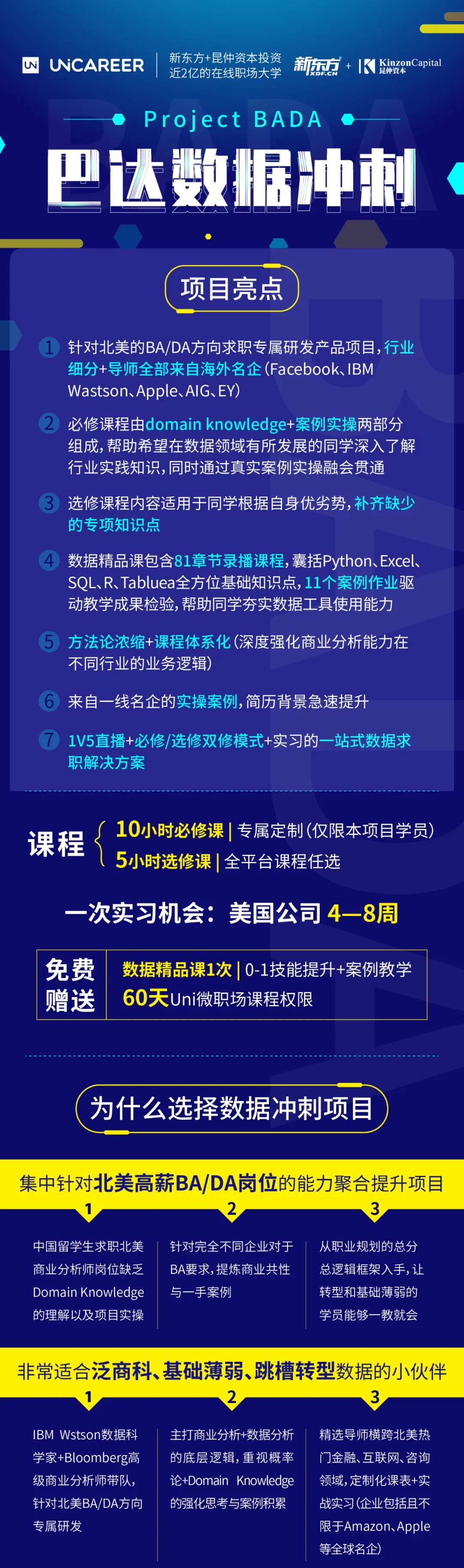 为了解决中国留学生在海外转型求职数据的种种问题,UniCareer邀请IBM Wstson数据科学家+Bloomberg高级商业分析师,针对北美(美国+加拿大)的BA/DA方向专属研发的数据冲刺项目: