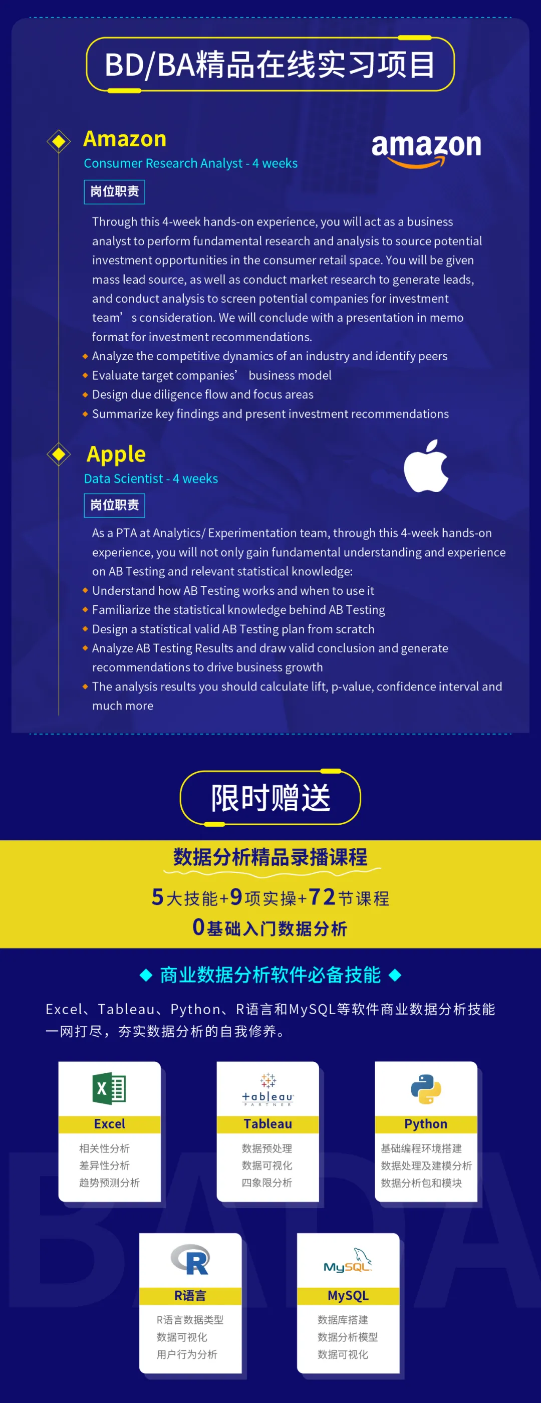 课程设计经历395天精细研发,特别适合泛商科、基础薄弱甚至是跳槽转型数据的全部小伙伴,主打商业分析+数据分析的底层逻辑,重视量化分析+Domain Knowledge的强化思考与案例积累,精选导师横跨北美热门金融、互联网、咨询领域,定制化课表+实战实习(企业包括且不限于Amazon、Apple等全球名企)。本次北美数据BADA(巴达)数据冲刺项目有7大亮点: