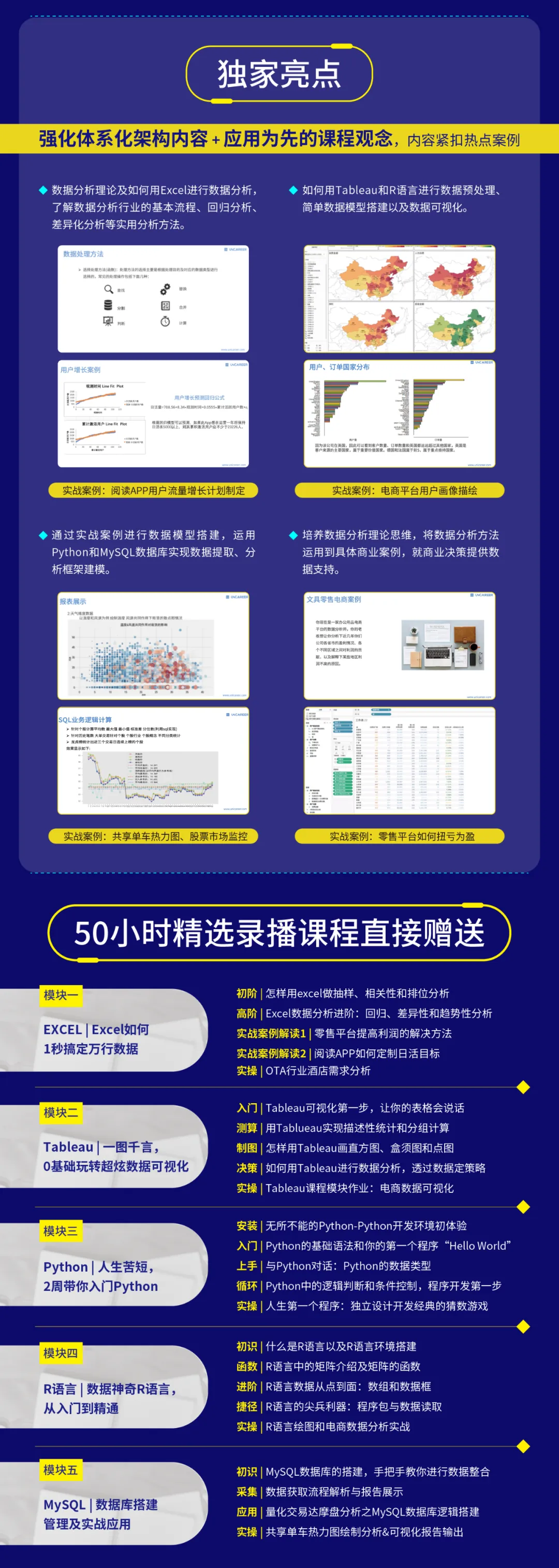 4. 数据精品课包含81章节录播课程,囊括Python、Excel、SQL、R、Tabluea全方位基础知识点,11个案例作业驱动教学成果检验,帮助同学夯实数据工具使用能力