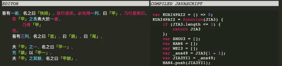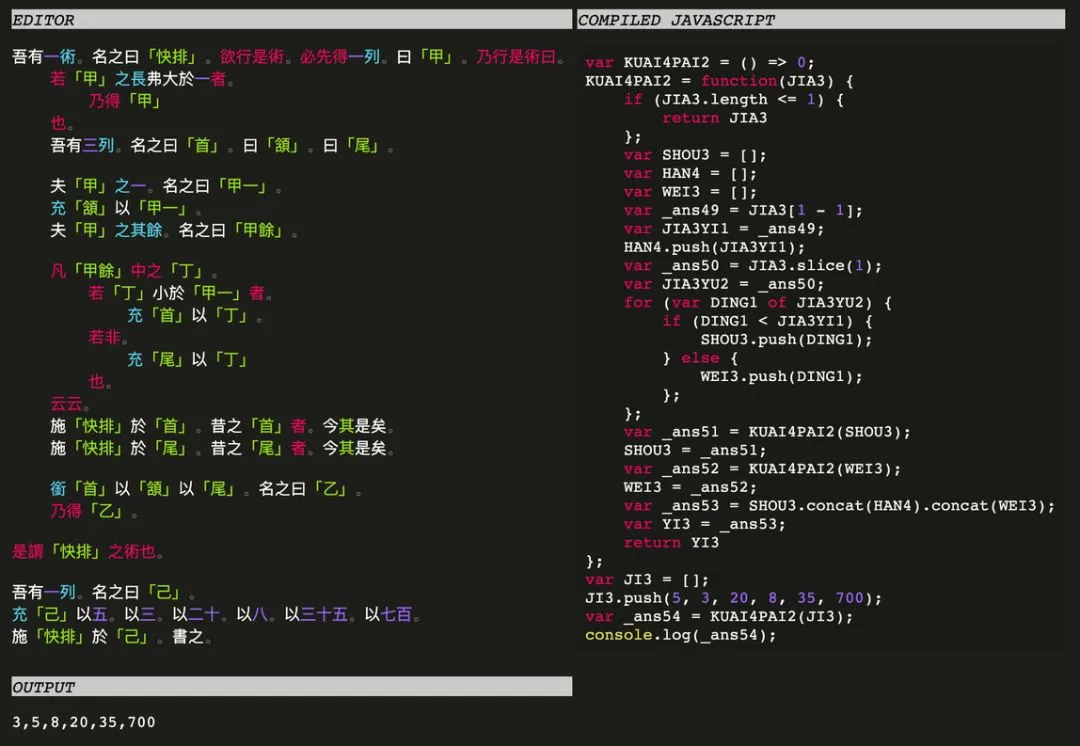 「昔者苍颉作书,而天雨粟,鬼夜哭」,汉字的出现,诞生了世界上一个伟大的文明。而编程语言的出现,让人类和计算机产生了真正的联系,推动了现代文明的发展。那么,将古代汉语和编程语言结合又会产生怎样的火花?最近,GitHub 上出现了一个文言文做代码的项目,几乎是世界上第一门文言文编程语言(当然,底层还是转换成 Python 或 JavaScript 运行)。