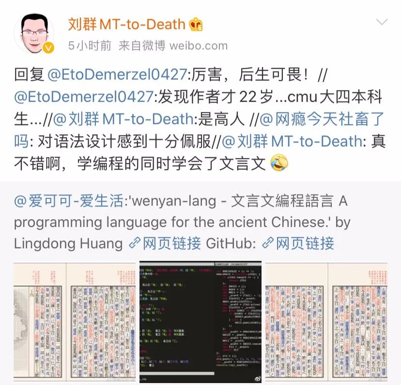 如果中文是编程语言中使用的主要语言,我们中国人学习编程是否会更简单?这是知乎上讨论非常火热的话题。很多接触过编程的人都知道「易语言」,这是一种使用中文代替编程语言中的英文的编程语言,同样可以实现程序功能。近日,一位卡内基梅隆大学(CMU)的大四学生开发了基于文言文的编程语言,高中语文三大怕的文言文终于找上程序员了。项目地址:https://github.com/LingDong-/wenyan-lang这一项目并不是简单的将程序中的英文字符换成了中文,而是利用 NLP 的一些技术,将文言文程序语法转换到 JavaScript 或 Python 运行,有一定的技术难度。项目问世几日即获赞 2.2K,还得到了很多人的微博转发。