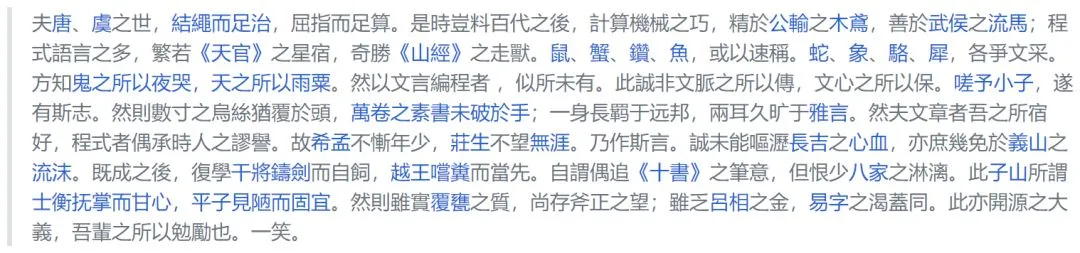 但以往从未有人使用过文言文进行编程。这并不是传承文脉、保护文心的好方法,所以我才产生了用文言文编程的想法。我目前还太年轻,读过的书也没有破万卷。如今身处遥远的国家(美国),也很久没有接触中文了。但是我一直对文学很有兴趣,编写的程序有时候也得到人们的一些肯定。正如王希孟和庄子一般,并不因为年轻或者知识的浩瀚无涯而退缩,于是写下了这些话。