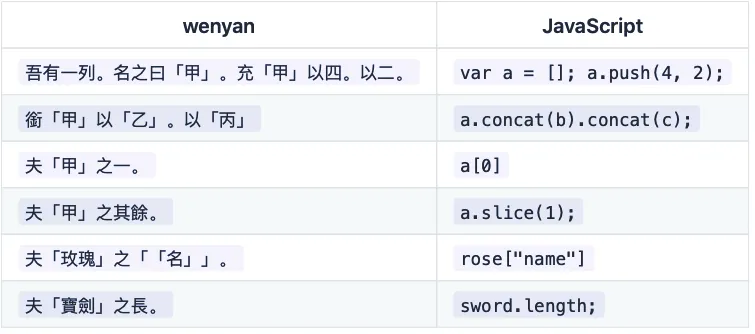 为了更贴近文言文的表达习惯,Lingdong Huang 在项目表示各种标点和换行都是可以去掉的,上面的文言文代码可以等价写为:吾有一數曰三名之曰「甲」為是「甲」遍吾有一言曰「「問天地好在」」書之云云