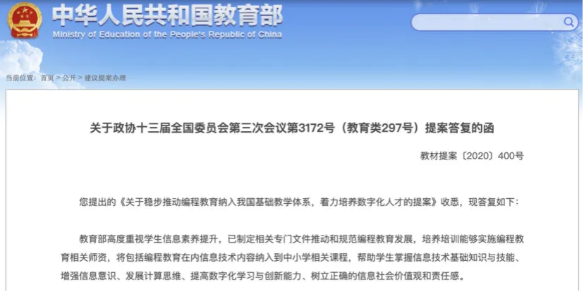 近日,教育部在给全国政协委员的答复函中称,教育部高度重视学生信息素养提升,已制定相关专门文件推动和规范编程教育发展,培养培训能够实施编程教育相关师资,将包括编程教育在内信息技术内容纳入中小学相关课程,帮助学生掌握信息技术基础知识与技能、增强信息意识、发展计算思维、提高数字化学习与创新能力、树立正确的信息社会价值观和责任感。