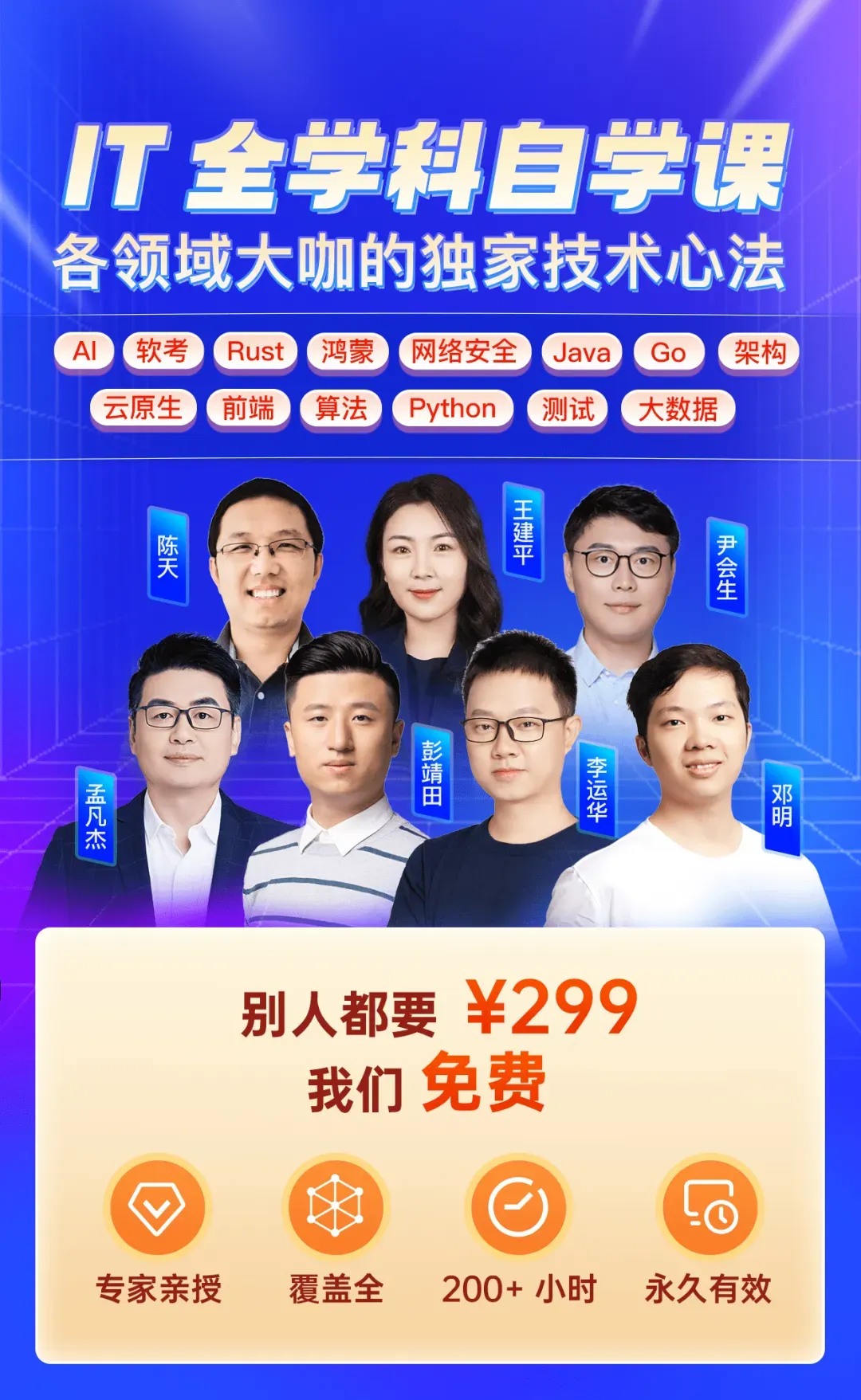 为此,我们邀请了前阿里 P9、Tubi TV 研发副总裁、腾讯云容器技术专家等 10+ 位业界大牛,为你带来 200+ 小时的免费 IT 全学科自学课程!让你一次性掌握 AI、Java、架构、Go、云原生、鸿蒙、Rust 等 14 个热门学科的核心技术!