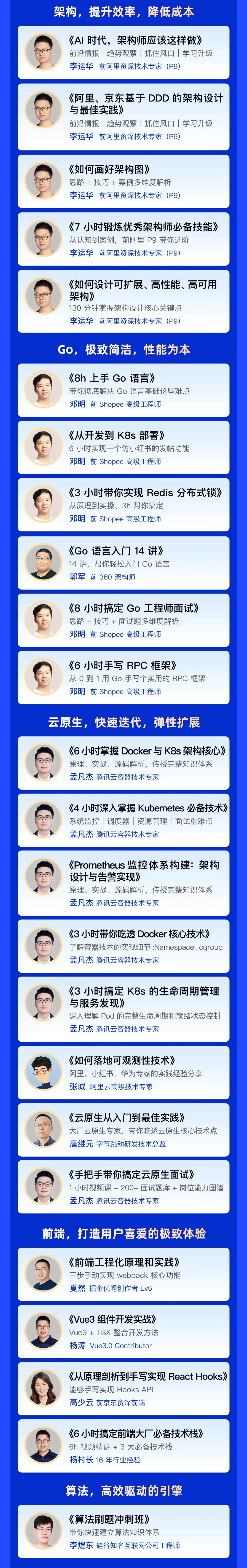 本次课程由业界知名讲师李运华、彭靖田、邓明等专家亲授,分享大厂实战经验,助力你在 IT 领域大展拳脚;200+ 小时精选课程,涵盖行业的各个角落;并且完全免费,是的,你没看错,所有课程完全免费,且永久有效!