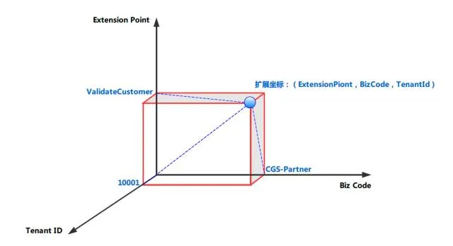 所以我们的业务身份实际上是(BizCode,TenantId)二元组。在每一个业务身份下面,又可以有多个扩展点(ExtensionPoint),所以一个扩展点实现(Extension)实际上是一个三维空间中的向量。借鉴Maven Coordinate的概念我给它起了个名字叫扩展坐标(Extension Coordinate),这个坐标可以用(ExtensionPoint,BizCode,TenantId)来唯一标识。
