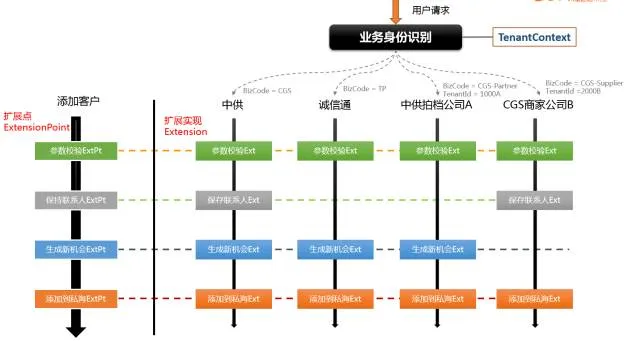 业务身份识别在我们的应用中非常重要,因为我们的CRM系统要服务不同的业务方,而且每个业务方又有多个租户。比如中供销售,中供拍档,中供商家都是不同的业务方,而拍档下的每个公司,中供商家下的每个供应商又是不同的租户。所以传统的基于多租户(TenantId)的业务身份识别还不能满足我们的要求,于是在此基础上我们又引入了业务码(BizCode)来标识业务。