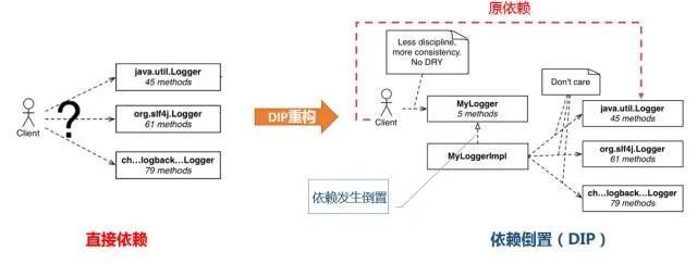 再比如在java应用中使用logger框架有很多选择,什么log4j,logback,common logging等,每个logger的API和用法都稍有不同,有的需要用isLoggable()来进行预判断以便提高性能,有的则不需要。对于要切换不同的logger框架的情形,就更是头疼了,有可能要改动很多地方。产生这些不便的原因是我们直接依赖了logger框架,应用和框架的耦合性很高。