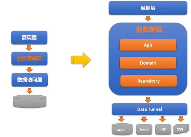 3.Repository层主要负责数据的CRUD操作,这里我们借用了盒马的数据通道(Tunnel)的概念,通过Tunnel的抽象概念来屏蔽具体的数据来源,来源可以是MySQL,NoSql,Search,甚至是HSF等。