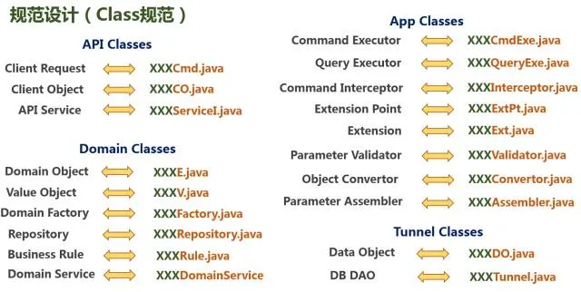 东西放在合适位置后还要贴上合适的标签,也就是要按照规范合理命名,例如我们架构里面和数据有关的Object,主要有Client Object,Domain Object和Data Object,Client Object是放在二方库中和外部交互使用的DTO,其命名必须以CO结尾,相应的Data Object主要是持久层使用的,命名必须以DO结尾。这个类名应该是自明的(self-evident),也就是看到类名就知道里面是干了什么事,这也就反向要求我们的类也必须是单一职责的(Single Responsibility)的,如果你做的事情不单纯,自然也就很难自明了。如果我们Class Name是自明的,Package Name是自明的,Module Name也是自明的,那么我们整个应用系统就会很容易被理解,看起来就会很舒服,维护效率会提高很多。我们的命名规则如下图所示: