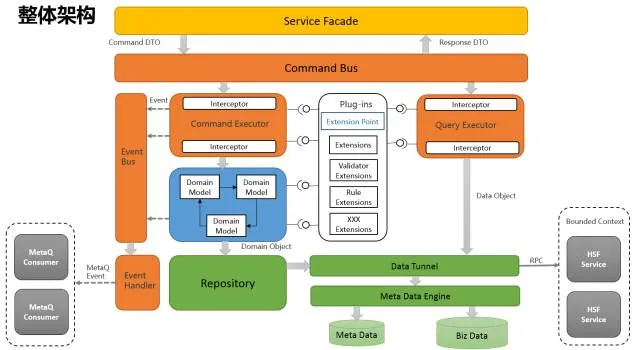 使用元数据的好处是不仅能支持字段扩展,还提供了丰富的字段描述,等于是为以后的SaaS化配置提供了可能性,所以我们选择了使用元数据引擎。和DDD一样,元数据也是可选的,如果对没有字段扩展的需求,就不要用。最后的整体架构图如下: