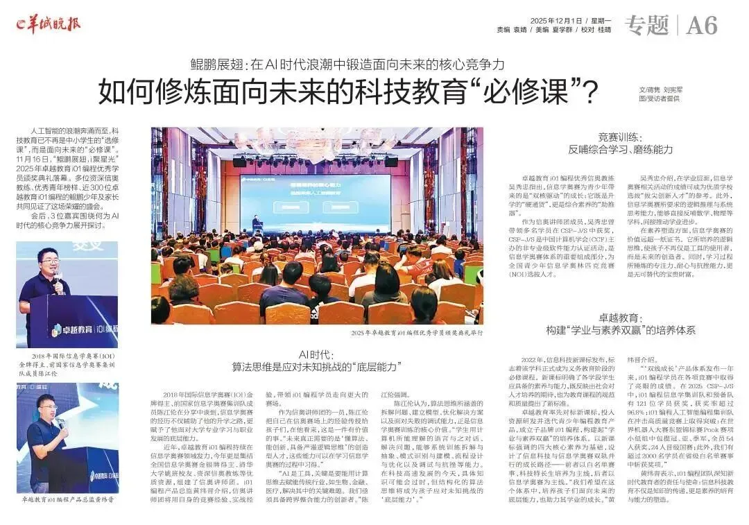 卓越教育率先对标新课标,投入资源研发并迭代青少年编程教育产品,成立子品牌i01编程,构建起“学业与素养双赢”的培养体系。以新课标强调的四大核心素养为基础,设计了信息科技与信息学奥赛双轨并行的成长路径——前者以白名单赛事、科技特长生培养为主线,后者以信息学奥赛为主线。“我们希望在这个体系中,培养孩子们面向未来的底层能力,也助力其学业的成长。”黄纬晋介绍。