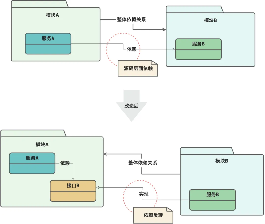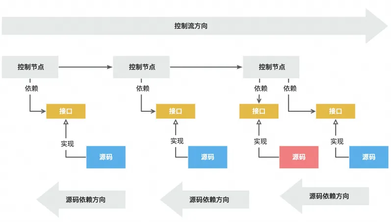 以上,我们可以得到提高代码可读性一个很重要的技巧:以描述目的和动机的方式解构过程,而不是盲目堆叠过程。但仅此而已吗,只是做了几个方法的拆分就足够吗。此时我们只要往代码的长尾运维角度进行思索,就能立刻找到破绽——“流程怎么进行扩展呢?”。目前我们控制流实现方式存在一个很大的隐患:控制流节点的实现依赖于源码细节。这一点几乎是致命的,由于控制流节点只描述目的和动机,过程的实现方式必然不止一种,假如后期运维时需要对控制流节点的过程进行二次扩展,就会立刻回到堆叠过程的混沌状态,可读性急剧下降。关于这一点,控制流的第二特性:细节无关原则给出了解法。早在三四十年前,当面向对象编程还没有兴起的时候,那时的程序员都是采用面向过程的C语言进行技术研发。对于一段程序的控制流来说,想要实现细节无关原则是一件极其困难的事情。缺少了面向对象的多态特性,接口概念的缺失让一段控制代码无可避免的会依赖于源码细节。而正是由于面向对象的一系列编程语言的出现让控制流脱离源码细节成为了可能。这其中的关键秘诀就是依赖反转。