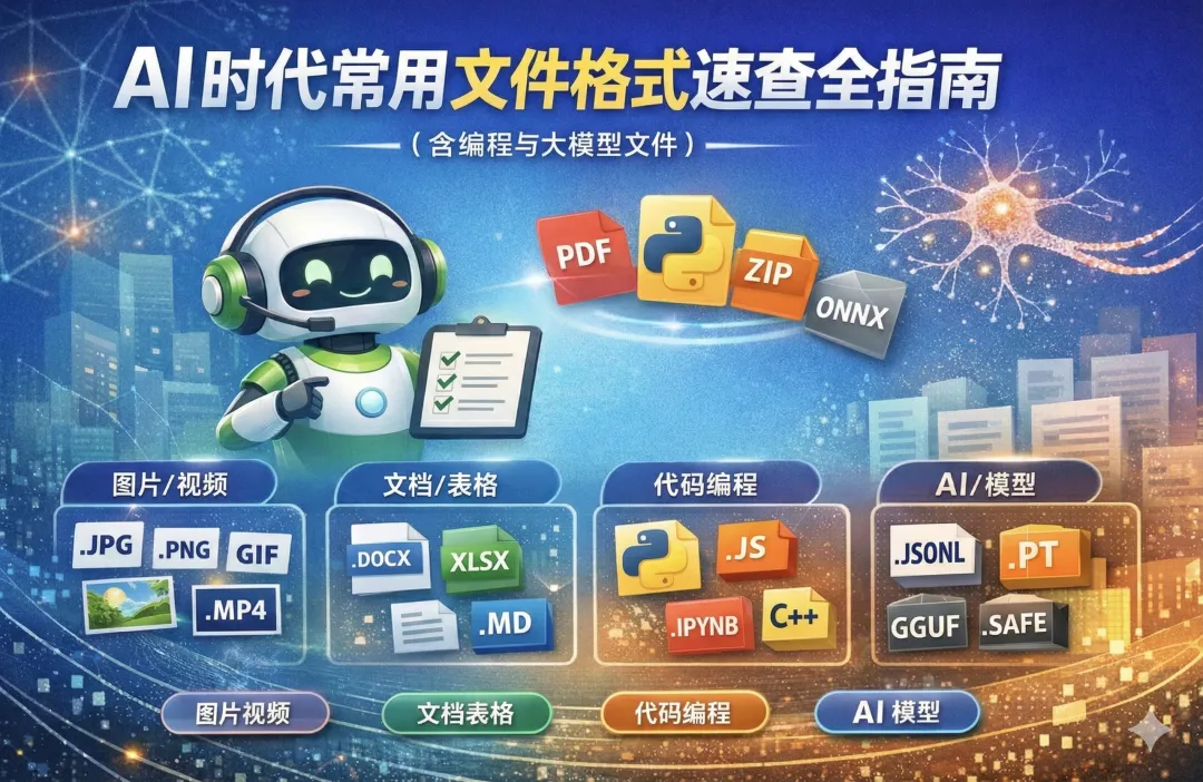 在 AI 时代,你会越来越频繁地和各种工具链打交道。很多效率差距,不是来自你会不会某个模型,而是来自你能不能一眼判断该用什么文件格式来存、来传、来训练、来部署、来交付。文件格式就是数字世界的通用接口。先把常见格式摸清楚,你的工作流会更稳,踩坑更少,协作更顺。