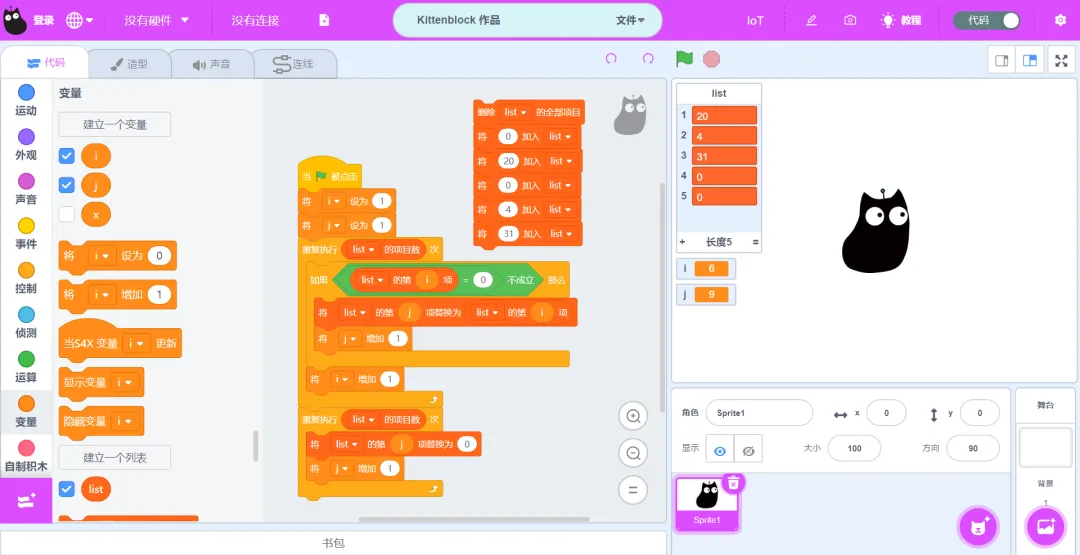 【题目描述】 有一组数据存放在列表“list”中,其中包含若干个0 元素。默认小猫角色和白色背景,请将列表中的所有 0 元素移动到列表尾,其余元素的前后顺序不变。 例如:列表“list”最初存放的数据为[0, 20, 0, 4, 31],移动0 元素之后的列表“list”为[20, 4, 31, 0, 0]。 【输入描述】 新建列表“list”,用于存放包含 0 元素的数据。【输出描述】 将 0 元素移动到列表“list”的尾部。最终的结果仍存放在“list”中。【输入样例】 list = [0, 20, 0, 4, 31] 【输出样例】 list = [20, 4, 31, 0, 0] 【输入样例】 list = [0, 7, 0, 22] 【输出样例】 list = [7, 22, 0, 0] 注意事项: 1、列表名、变量名的拼写(包括大小写)要和题目完全一致。2、列表直接用“+”功能赋值进行测试即可,无需写代码赋值。