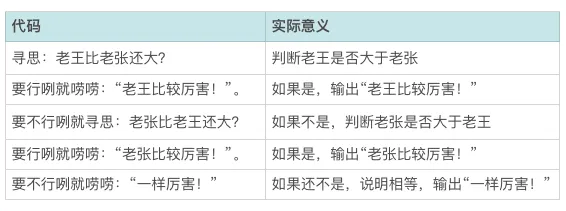 再比如想比两个数的大小,x叫老王,y叫老张。谁更大就输出“某某比较厉害”,相等就输出“一样厉害”。写成程序就是表格的左边: