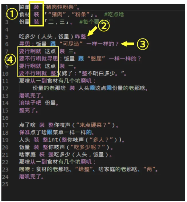 既然是东北话编程,那不得整个东北特色小程序?想来想去我整了个计算猪肉炖粉条所需食材数目的小程序: