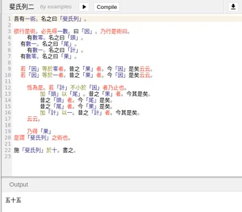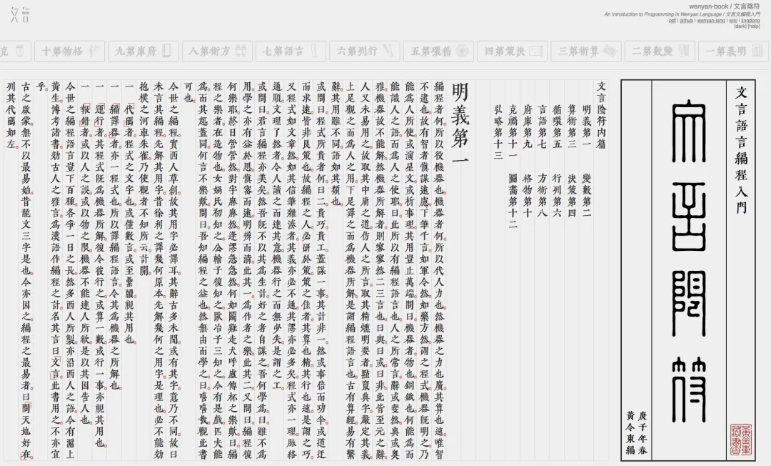 上面的编程方式虽然用的是中文,但整个语法基于英文编程,看起来还是令人费解。19年发布的文言文编程项目“文言 / wenyan‑lang”更进一步,让编程看起来真的像古文了。