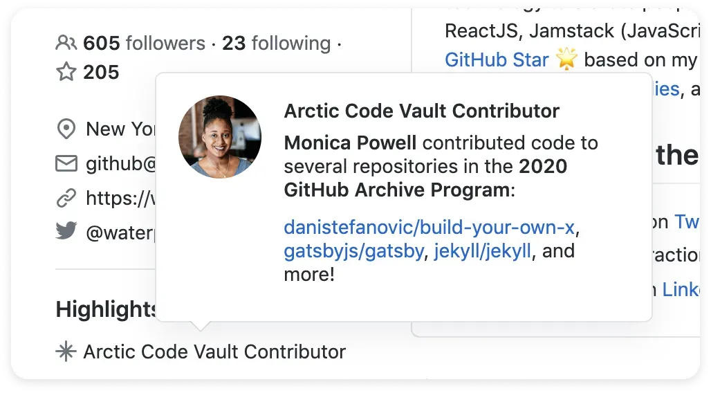 为了表彰这些程序员们,GitHub还设计了荣誉徽章。只要鼠标在开发者主页资料介绍部分悬停,就能看到有哪些项目被放到了北极。
