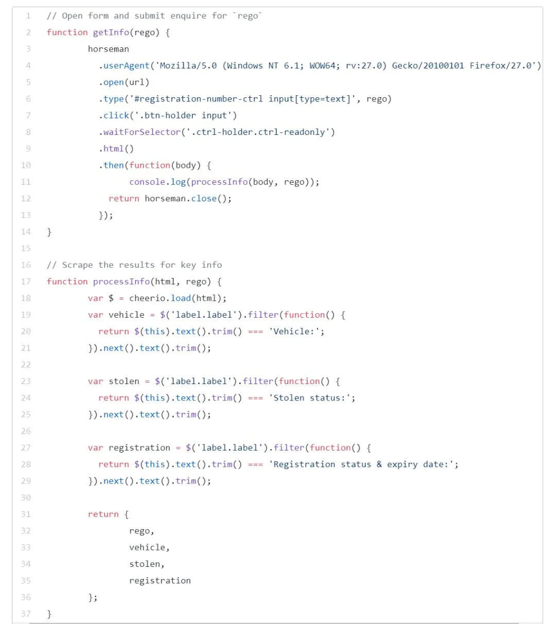 VicRoads的API不能被公开访问,所以我们通过网络爬虫对进行车牌检查。虽然这样做不太好,但这就是一个概念证明,我也不会攻击任何人的服务器。