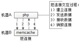 上图是一种典型场景,站点php部署在机器A上,缓存memcache部署在机器B上,之间通过短连接通信,过程为: