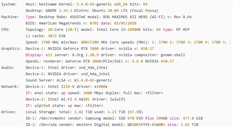 #!/bin/bashecho"=== Hardware Inventory Report ==="echo"Manufacturer: $(cat /sys/class/dmi/id/sys_vendor)"echo"Product: $(cat /sys/class/dmi/id/product_name)"echo"Serial: $(sudo dmidecode -s system-serial-number)"echo"CPU: $(lscpu | grep "Model name" | cut -d: -f2 | sed 's/^[ \t]*//')"