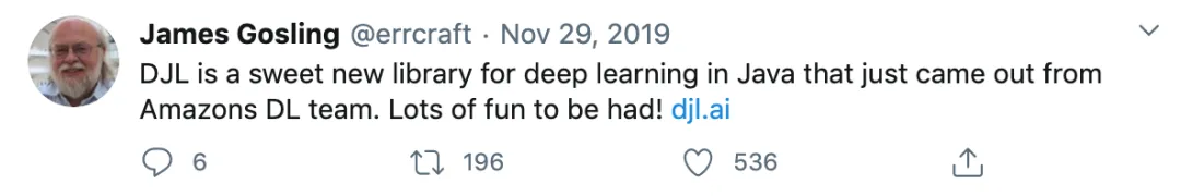 深度学习领域中有很多面向Python开发者的资源与教程,比如使用NumPy进行数据分析、使用MatPlotlib进行可视化等;深度学习框架方面,TensorFlow、PyTorch、MXNet等常用框架都对Python有很好的支持。相比而言在企业项目中,Java、Scala等虽然是使用最多的开发语言,但各类主流深度学习框架面向Java开发者的支持非常少。Java开发者必须要进行繁杂的项目配置,构建class,才能最终打造出属于Java的深度学习应用。如果你是一名Java应用开发工程师,并正在尝试将 AI 技术融入到项目中,那么这款被Java创始人James Gosling点赞的深度学习框架DJL是一个不错的选择。DJL(Deep Java Library )是亚马逊在2019年宣布推出的开源的深度学习开发包,它是在现有深度学习框架基础上使用原生Java概念构建的开发库。它为开发者提供了深度学习的最新创新和使用前沿硬件的能力,例如GPU、MKL等。简单的API抽象并简化了开发深度学习模型所涉及的复杂性,使得DJL更易于学习和应用。有了model-zoo中绑定的预训练模型集,开发者可以立即开始将深度学习的SOTA成果集成到Java应用当中。